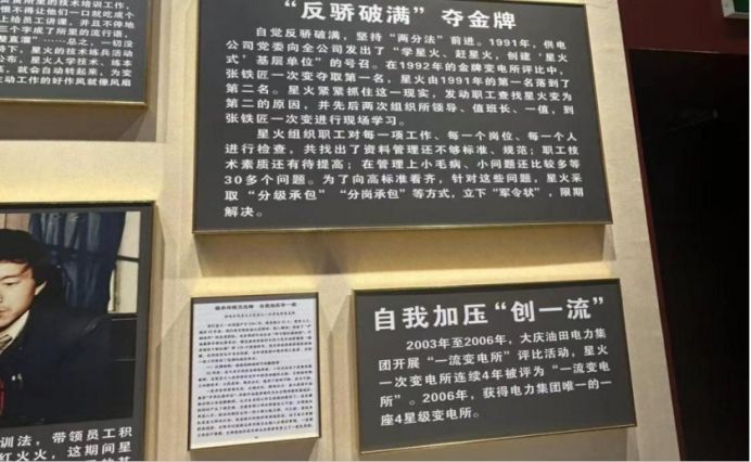 在文化展墙上“星火耀油田”“团队好作风”“干部打先样”几大模块分别展示了员工管理体制、领导班子交接制度、老火星人的拉肩扛精神等。同时,星火变电所党支部管理采用“微型党课大家讲”模式,让党员轮流讲党课,通过备课、讲解、交流,增强党性认识和党员素质。